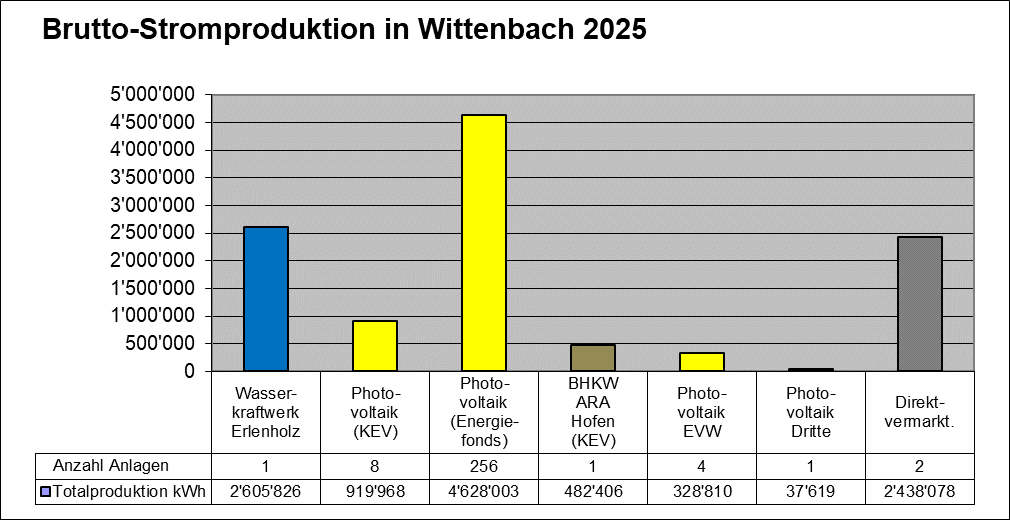 Die gesamte Stromproduktion auf dem Gebiet der Gemeinde Wittenbach (rund 11.5 Millionen kWh, inkl. KEV und Direktvermarktung) entspricht dem Jahresverbrauch von ca. 3250 Haushalten. Somit stammt 33.1% (VJ: 22,6 %) des Stromverbrauchs aus erneuerbaren Quellen in Wittenbach.
