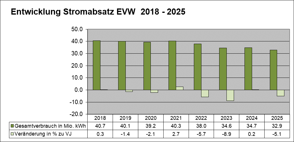 Die EVW verzeichnete im Kalenderjahr 2025 gegenüber dem Vorjahr einen leicht rückläufigen Stromabsatz. Nach wie vor wächst die Anzahl privater PV-Anlagen. Auch die Bildung von Zusammenschlüssen zum Eigenverbrauch (ZEV) nimmt weiterhin stark zu. Dadurch steigt der Anteil selbst produzierter und direkt verbrauchter Energie in Wittenbach. Der reduzierte Bezug aus dem Netz der EVW wurde teilweise ausgeglichen durch einen wachsenden Stromverbrauch der übrigen Kundinnen und Kunden. Gesamthaft wurden 32,9 Millionen kWh abgesetzt (VJ: 34,7 Mio. kWh).
